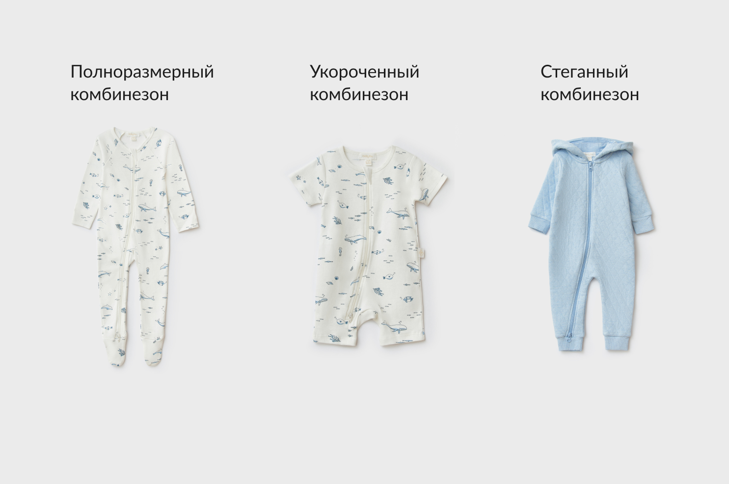 Длина. Комбинезоны для роста и полукомбинезоны предназначены для закрытия большей части ног ребенка по сравнению с боди, которые не имеют в конструкции ножек и предназначены для прикрытия области подгузника. Однако и комбинезоны, и боди могут быть без рукавов, с длинными и короткими рукавами.