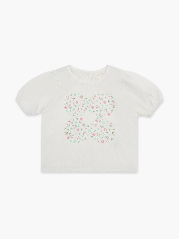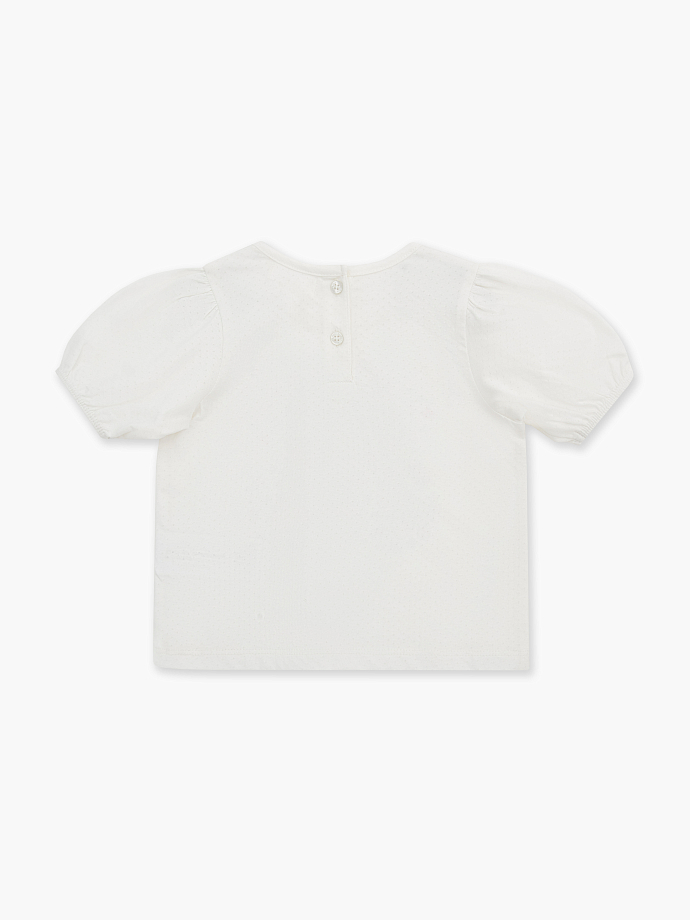 -Футболка имеет свободный крой и рукава-фонарики, которые придают ей особый шарм и подчеркивают детскую непосредственность.