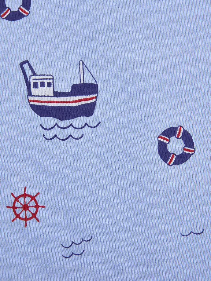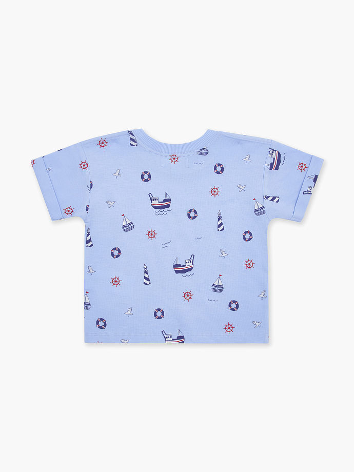 -Красивый лазурный оттенок легко сочетается с различными шортами, джинсами и брюками. А авторский принт в морской тематике добавляет свежести образу.