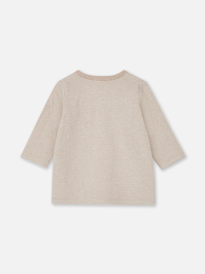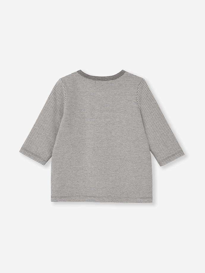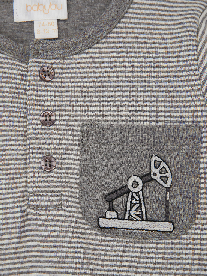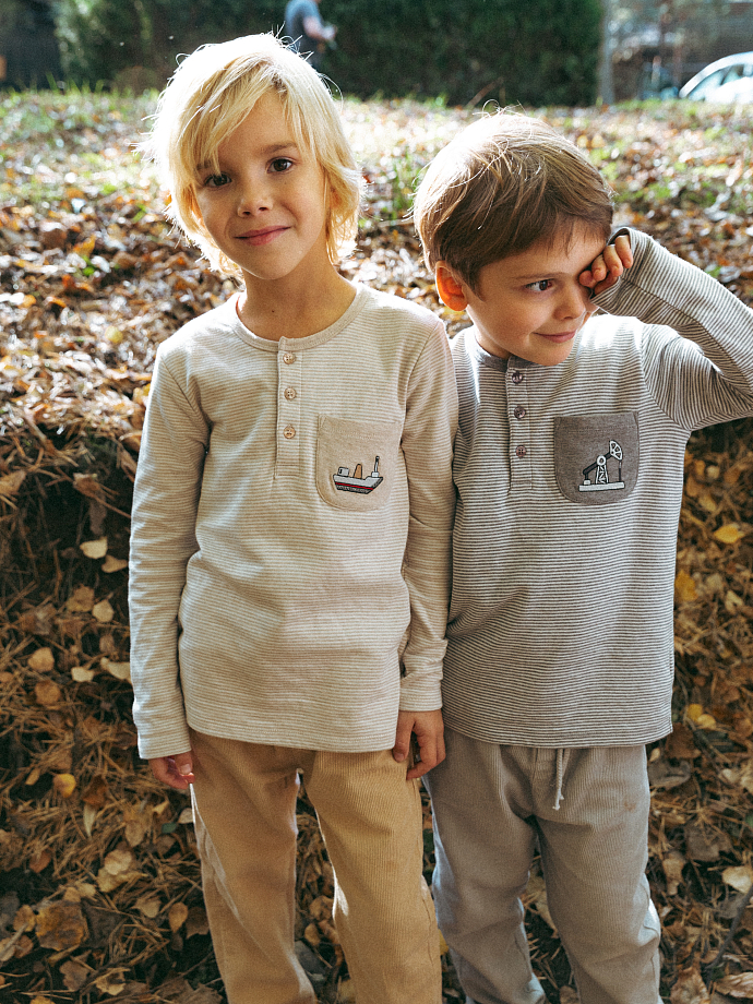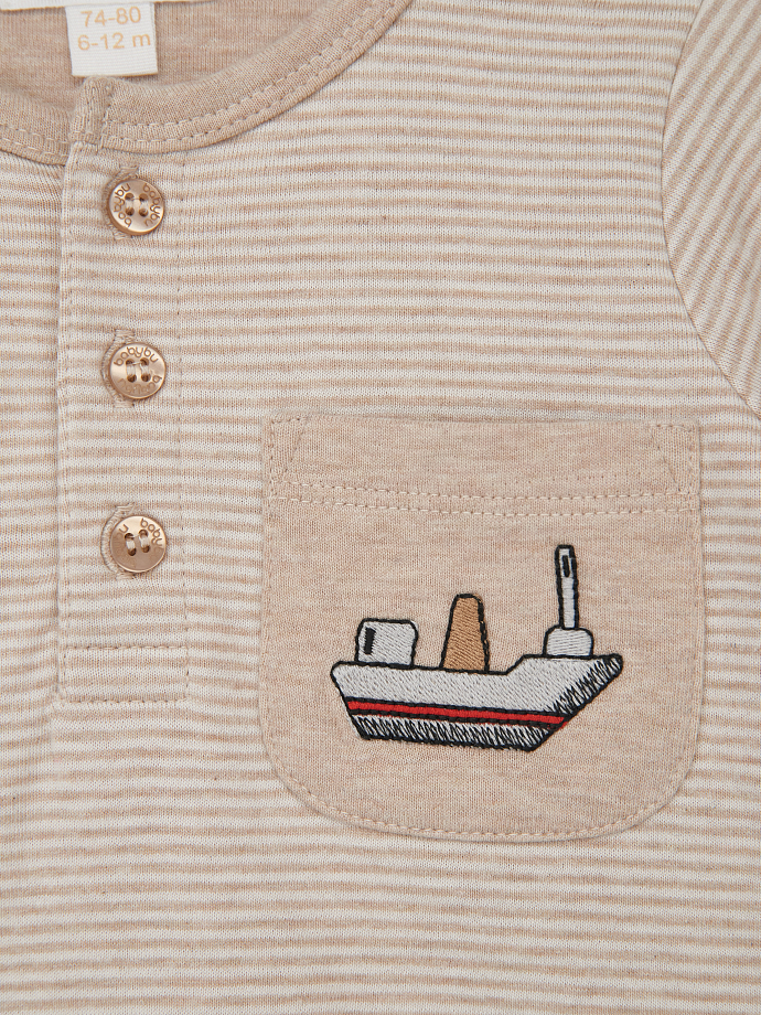 Трикотаж из 100 % органического хлопка «дышит», гипоаллергенен и остаётся мягким даже после частых стирок. Планка-поло на трёх пуговицах упрощает переодевание и регулирует горловину, а плоские внутренние швы предотвращают натирание.