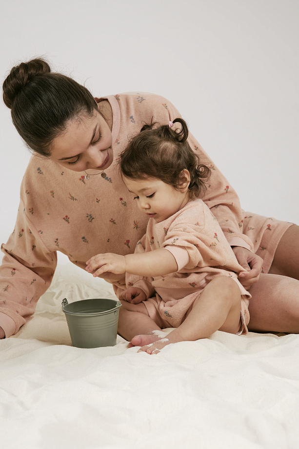 Модный комплект для прогулок и пляжа с принтом «Полевые цветы» - идеальный выбор для стильных девочек, которые ценят комфорт и качество. В состав комплекта входят толстовка и шорты. Изготовлены из 100% органического хлопка (таулинг), гарантируя мягкость и комфорт при носке.