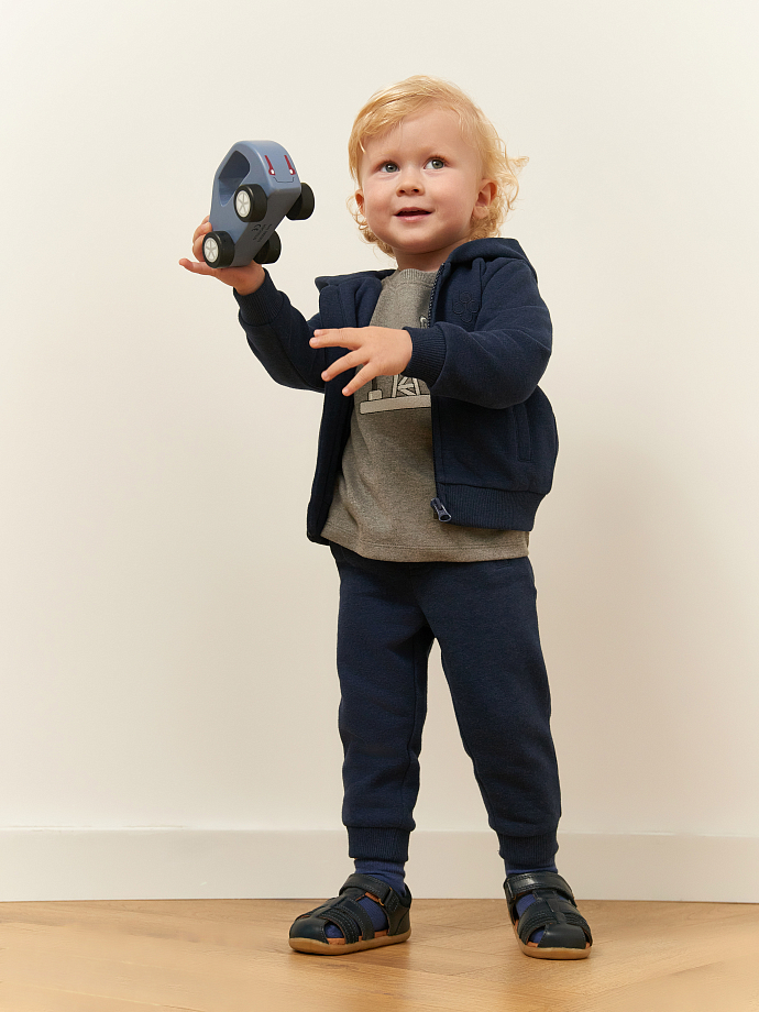 Универсальный костюм для малышей — тёплая толстовка на молнии с капюшоном и удобные брюки с эластичным поясом. Изготовлен из мягкого хлопка, не сковывает движений и отлично сохраняет тепло. Идеален для прогулок, активных игр и комфортного повседневного ношения в прохладное время года.