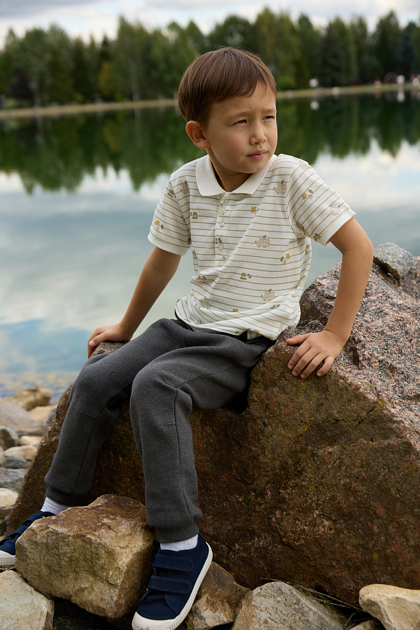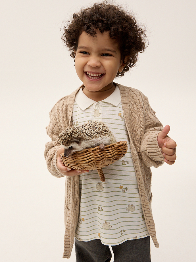 Футболка-поло базового сегого цвета или вариант в полоску с анималистичным принтом отлично подходит для маленьких модников. Изготовлена из 100% органического хлопка “Пике”, что обеспечивает максимальный комфорт и свободу движений в любой ситуации.